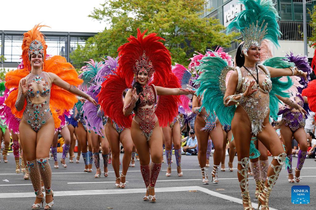 Artists perform samba at the 2026 National Multicultural Festival in Canberra, Australia, Feb. 7, 2026. The festival, held from Feb. 6 to 8 in Canberra, attracted visitors with music, dance performances and delicious food. (Photo by Chu Chen/Xinhua)