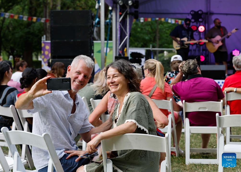 A couple takes a selfie at the 2026 National Multicultural Festival in Canberra, Australia, Feb. 7, 2026. The festival, held from Feb. 6 to 8 in Canberra, attracted visitors with music, dance performances and delicious food. (Photo by Chu Chen/Xinhua)