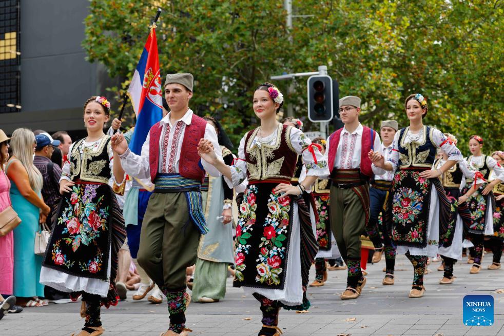 People wearing Serbian traditional clothes attend the 2026 National Multicultural Festival in Canberra, Australia, Feb. 7, 2026. The festival, held from Feb. 6 to 8 in Canberra, attracted visitors with music, dance performances and delicious food. (Photo by Chu Chen/Xinhua)