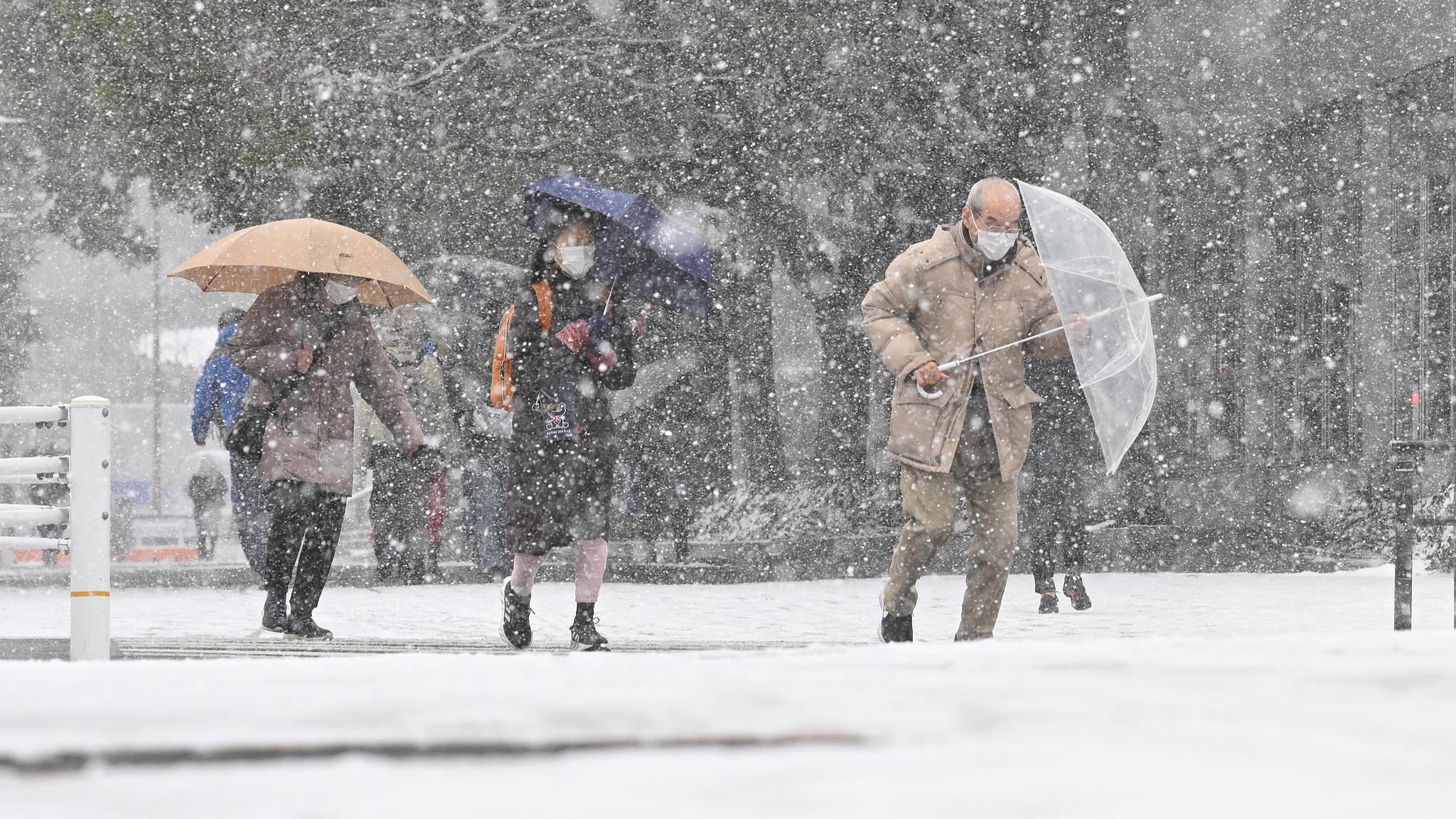 Snow falls on a street in Koto Ward, Tokyo, on February 8, 2026. (Photo: VCG)