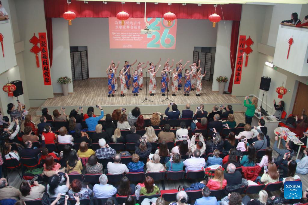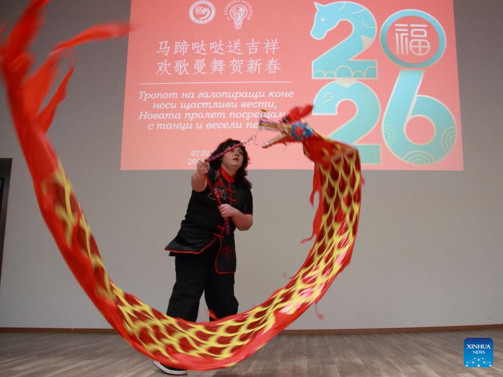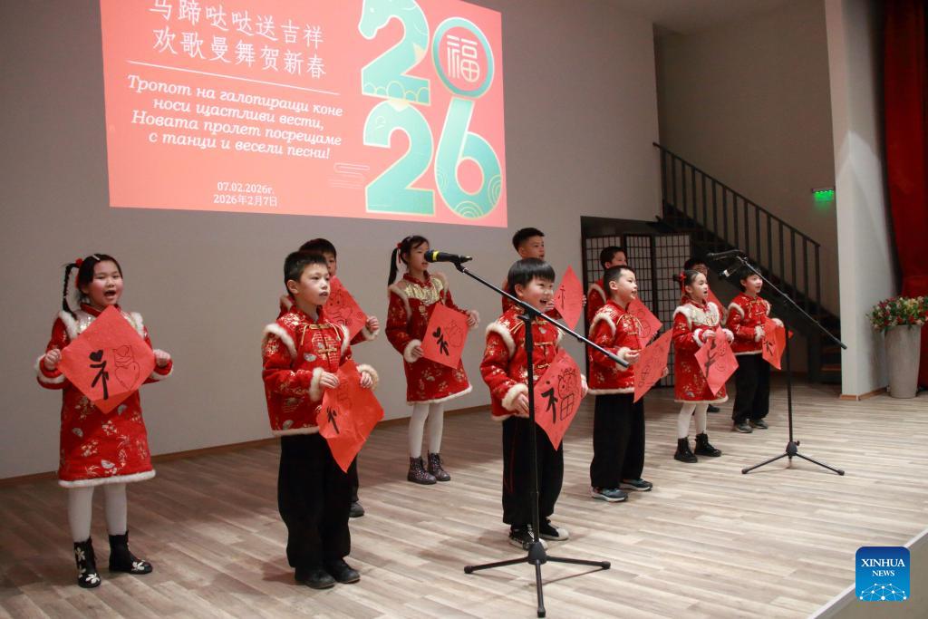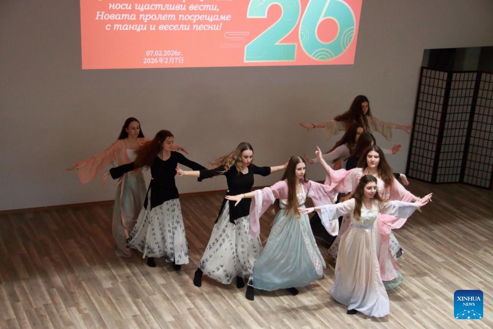 Bulgarian students perform during a celebration of the upcoming Chinese New Year at the Confucius Institute in Sofia, Bulgaria, Feb. 7, 2026. (Photo by Marian Draganov/Xinhua)