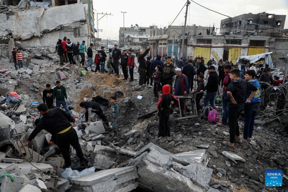 Palestinians inspect the damage after an Israeli airstrike that destroyed a three-story building in the Zeitoun neighborhood, southeast of Gaza City, on Feb. 6, 2026. (Photo: Xinhua)