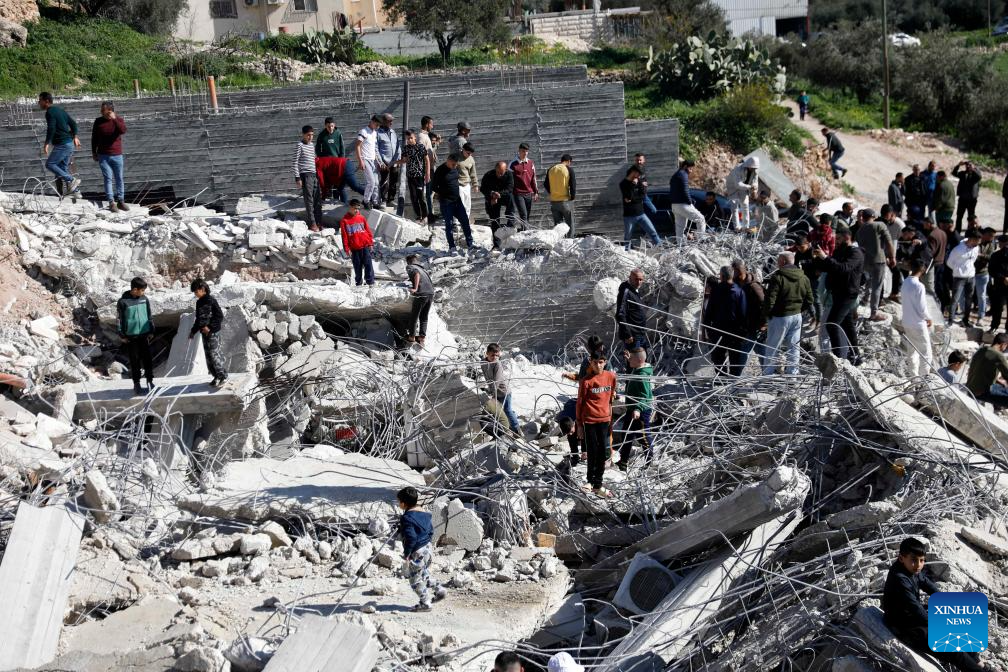 Palestinians inspect a destroyed house after an Israeli military excavator demolished it in the town of Beit Awa, west of Hebron in the West Bank, on Feb. 5, 2026. (Photo: Xinhua)