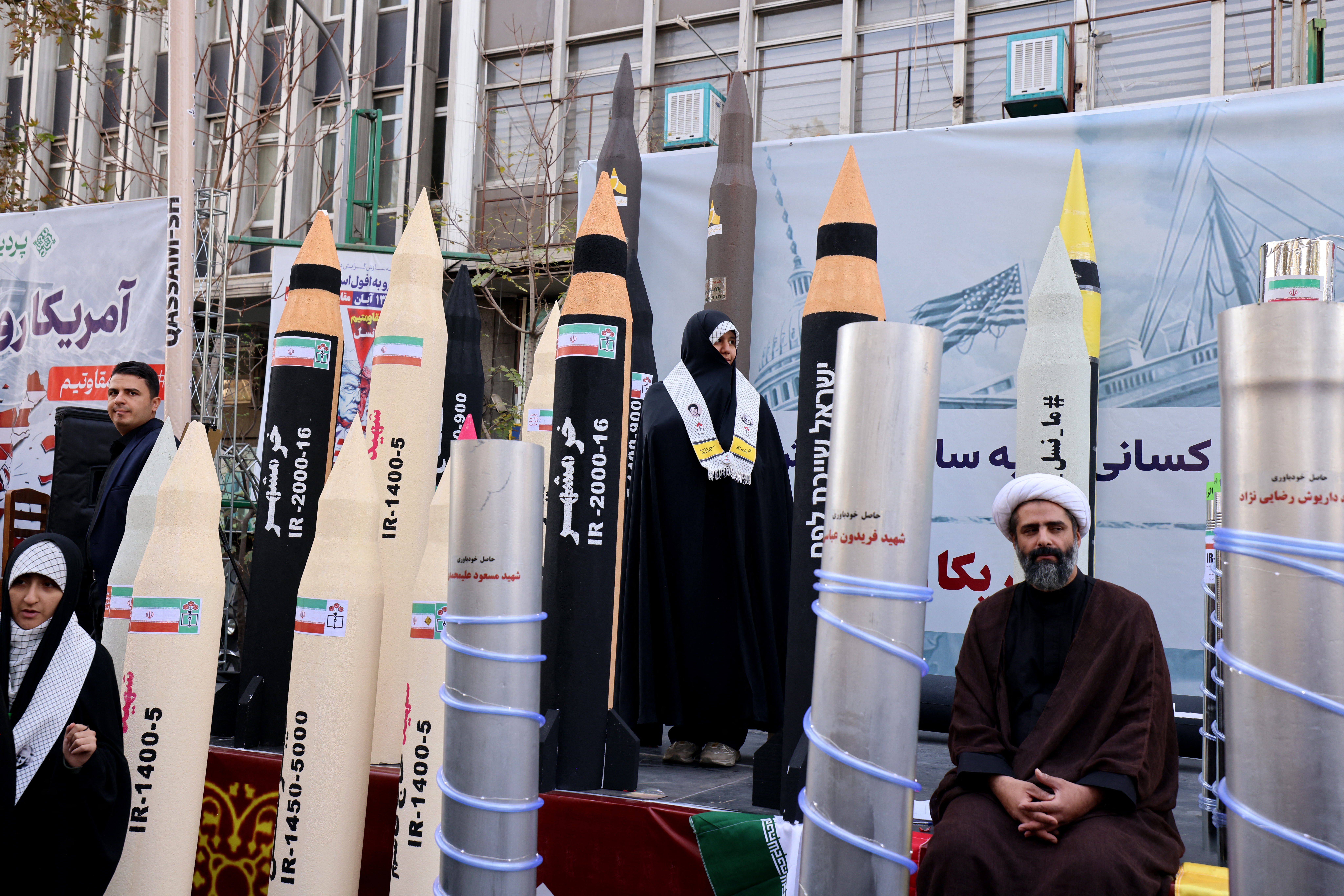 People sit and others stand next to models missiles and nuclear enrichment centrifuge during a rally outside the former US embassy in Tehran as Iranians mark the 46th anniversary of the start of the Iran hostage crisis, on November 4, 2025. (File photo: AFP)
