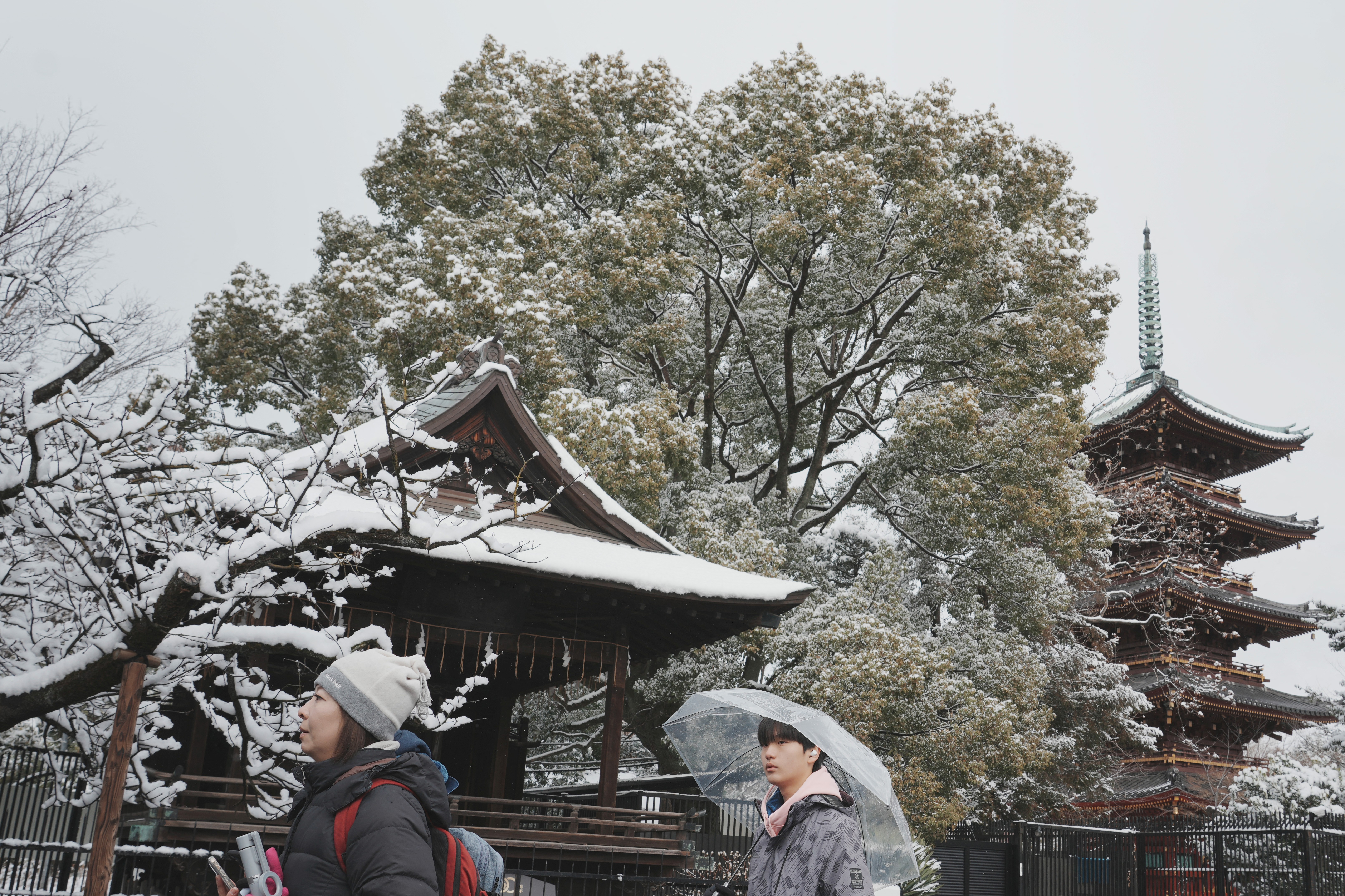 Tourists visit Toshogu Shrine in Ueno Park during a snowfall in Tokyo on February 8, 2026. (Photo: AFP)