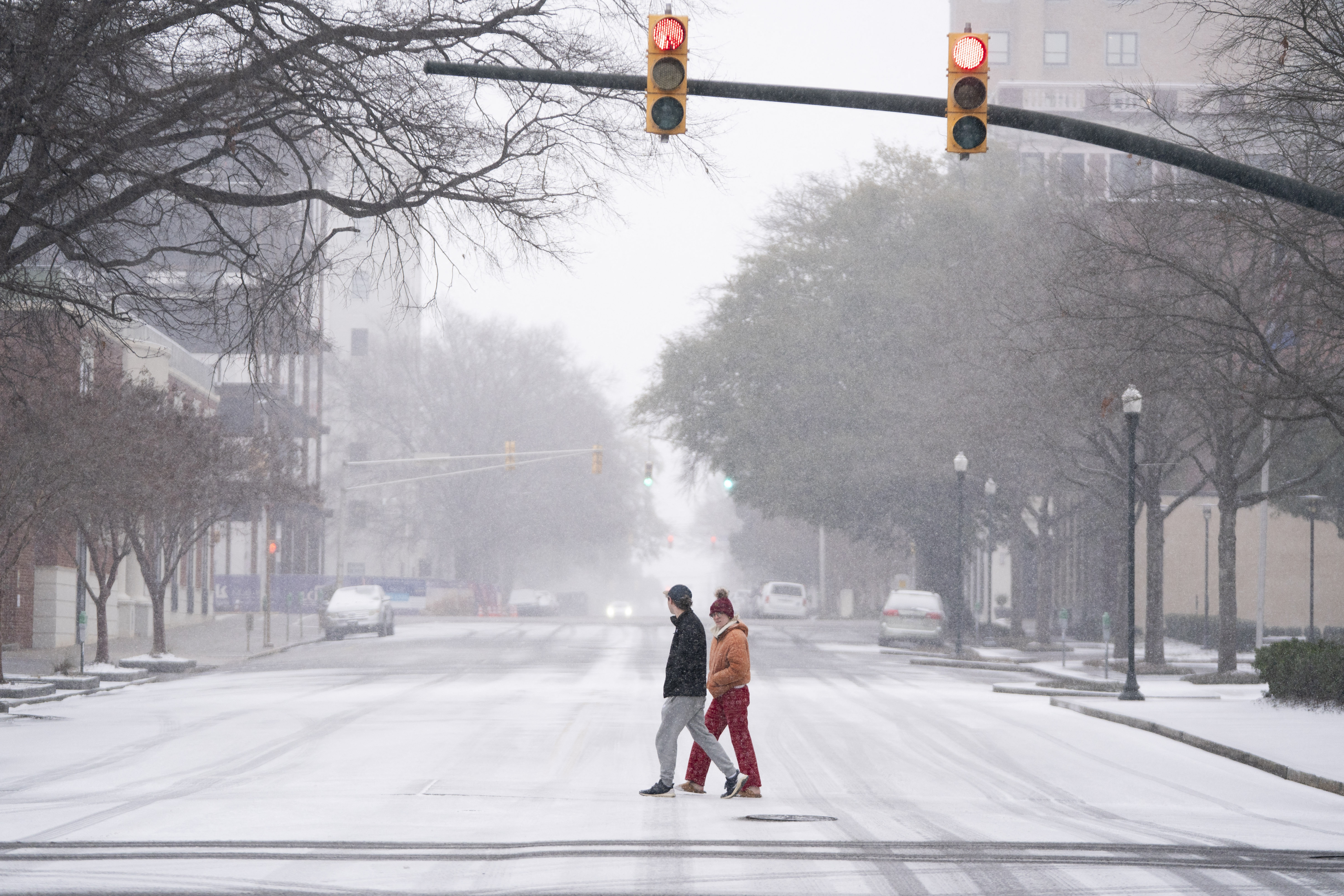 People cross a street as snow falls on January 31, 2026 in Columbia, South Carolina. (Photo: AFP)