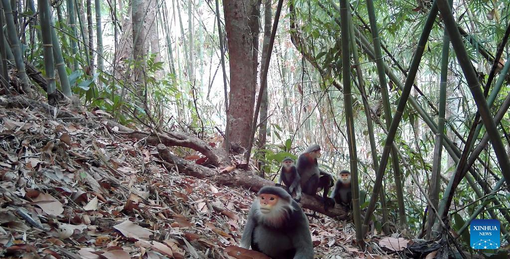 A camera-trap captures Douc langurs at the Virachey National Park in northeastern Cambodia on Aug. 22, 2025. A camera-trap biodiversity survey has revealed the remarkable diversity of wildlife species inhabiting the vast, untouched, and biodiverse Virachey National Park in northeastern Cambodia, said a joint press release on Wednesday. (Fauna & Flora/Handout via Xinhua)