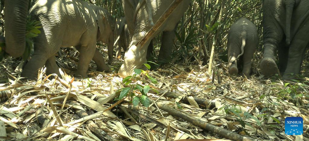 A camera-trap captures a herd of Asian elephants at the Virachey National Park in northeastern Cambodia on April 9, 2025. A camera-trap biodiversity survey has revealed the remarkable diversity of wildlife species inhabiting the vast, untouched, and biodiverse Virachey National Park in northeastern Cambodia, said a joint press release on Wednesday.(Fauna & Flora/Handout via Xinhua)