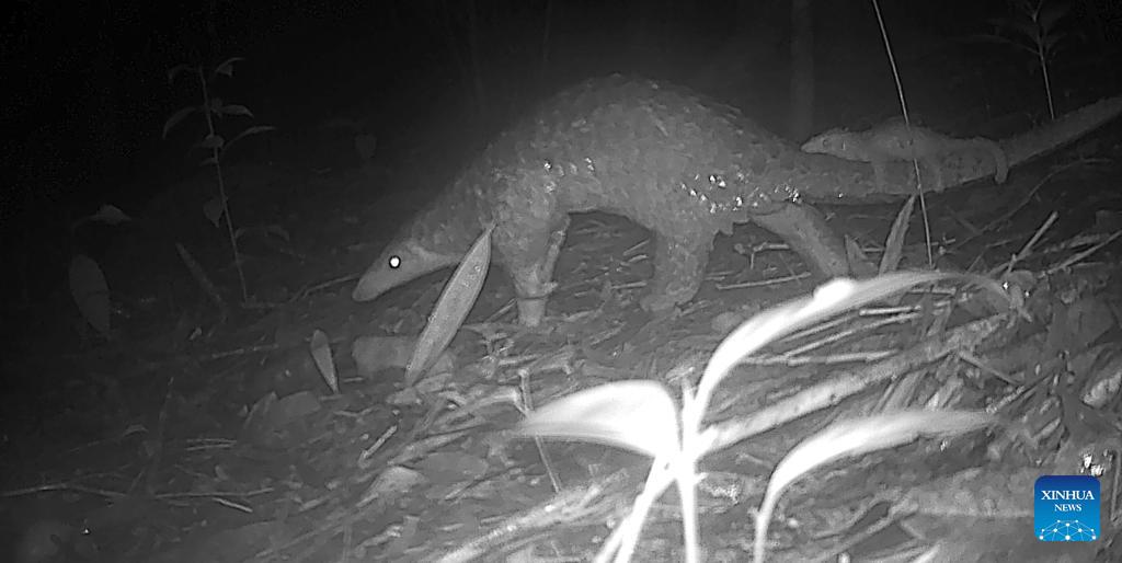 A camera-trap captures a Sunda pangolin with her baby at the Virachey National Park in northeastern Cambodia on July 20, 2025. A camera-trap biodiversity survey has revealed the remarkable diversity of wildlife species inhabiting the vast, untouched, and biodiverse Virachey National Park in northeastern Cambodia, said a joint press release on Wednesday.(Fauna & Flora/Handout via Xinhua)