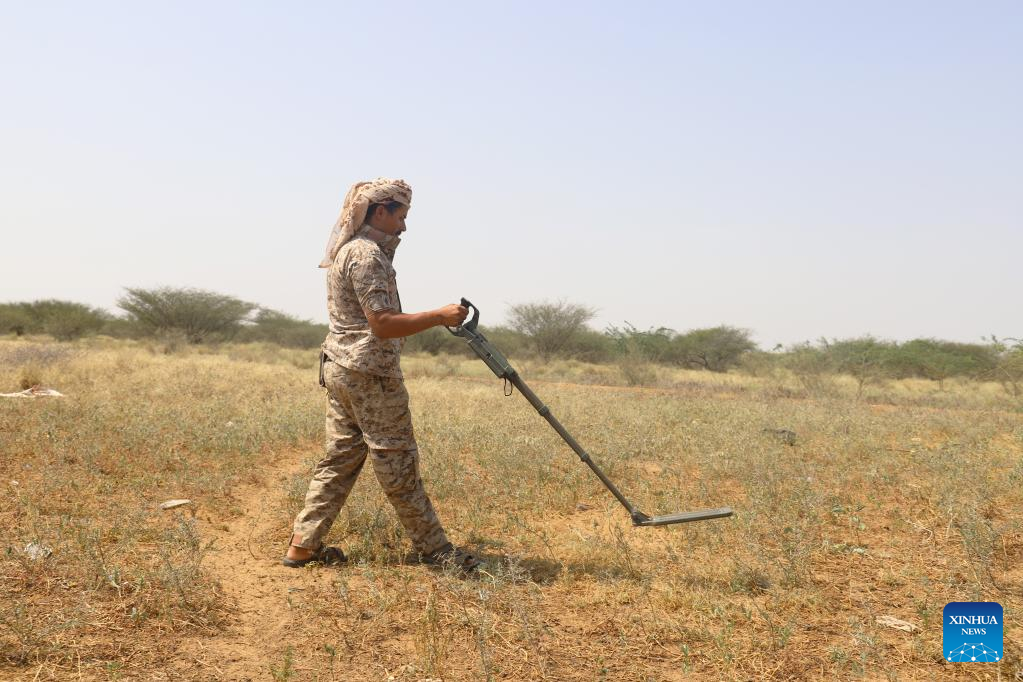 A soldier of a demining team uses a landmine detector to clear a pasture in the Abs district, Hajjah Province, northern Yemen, on October 7, 2022. (File photo: Xinhua)