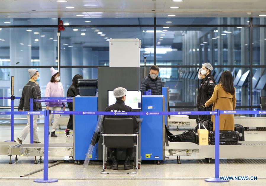 Passengers pass security checkpoint at Terminal 2 building of the Shanghai Pudong International Airport in east China's Shanghai, November 24, 2020. (File photo: Xinhua)