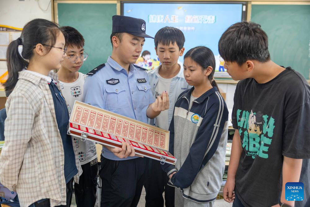 A police officer introduces anti-drug knowledge to students at a school in Taizhou, East China's Jiangsu Province, June 26, 2025. (Photo: Xinhua)