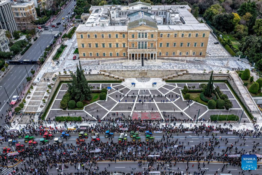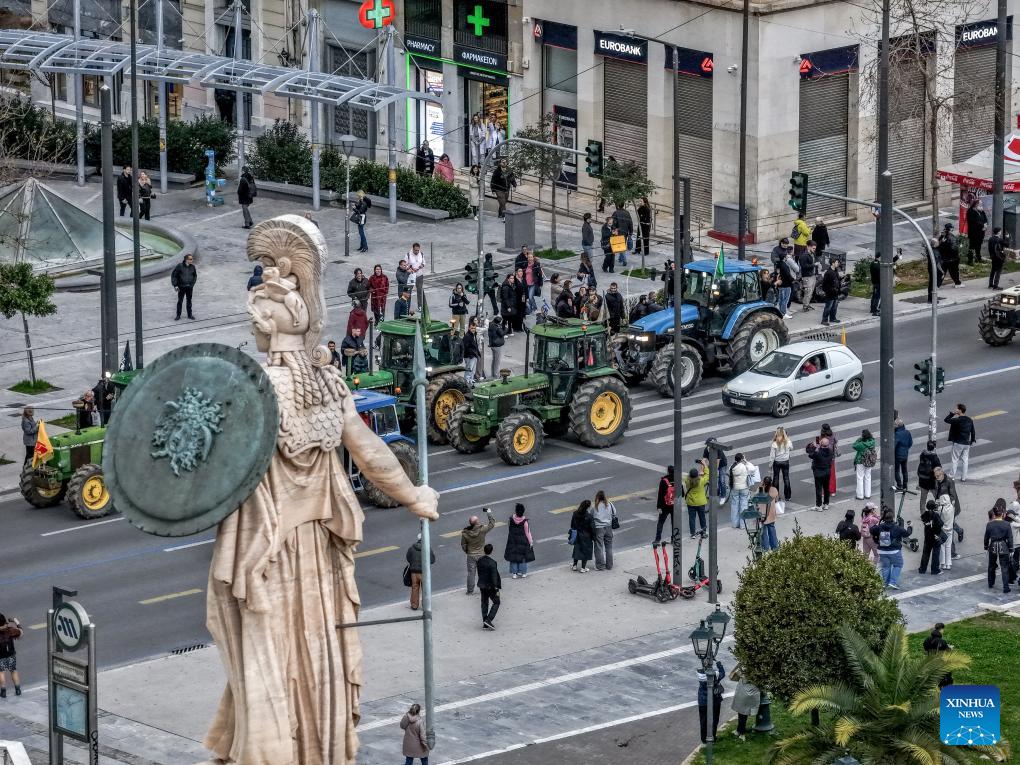 ATHENS, Feb. 13 (Xinhua) - Farmers from across Greece gathered in the capital Athens on Friday for a nationwide rally, driving tractors and agricultural machinery into Syntagma Square.