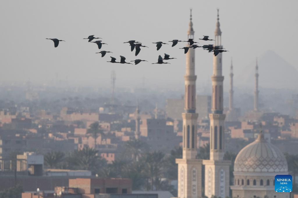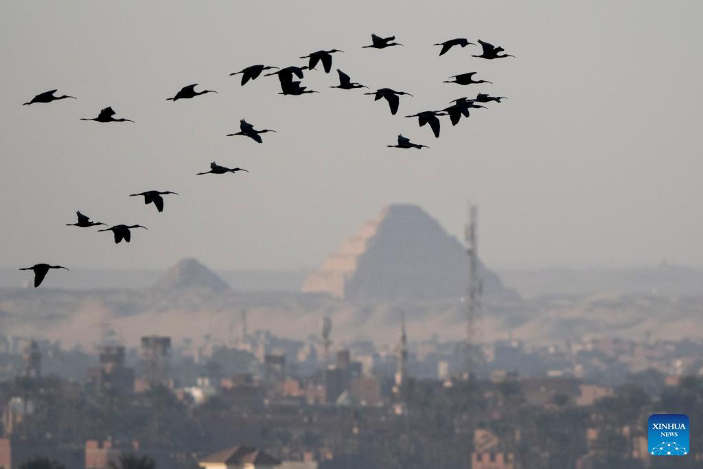 Migratory birds fly above Giza, Eygpt, on Feb. 13, 2026. (Xinhua/Liu Minhao)