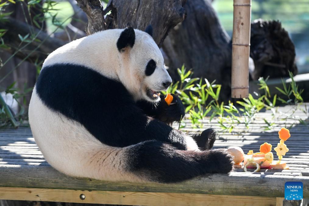 Giant panda Jin Xi eats bamboo at the Madrid Zoo in Madrid, Spain, on Feb. 14, 2026. The Madrid Zoo held celebrations for the Chinese New Year, featuring lion dance performances, Chinese shadow puppetry and calligraphy workshops. (Photo by Gustavo Valiente/Xinhua)