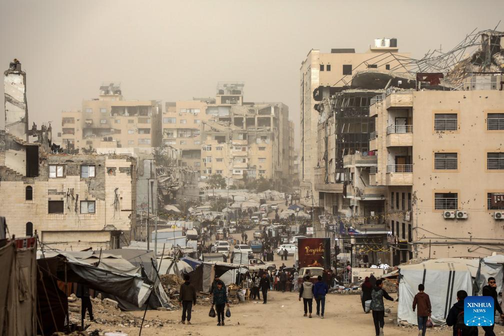 Palestinians walk among the rubble during a dust storm in southern Gaza City on Feb. 14, 2026. (Photo by Rizek Abdeljawad/Xinhua)