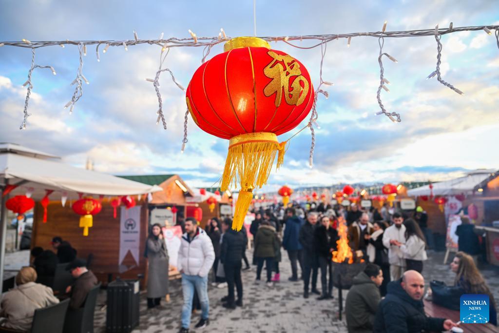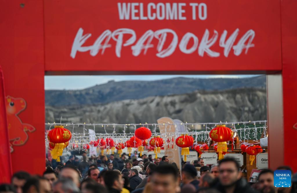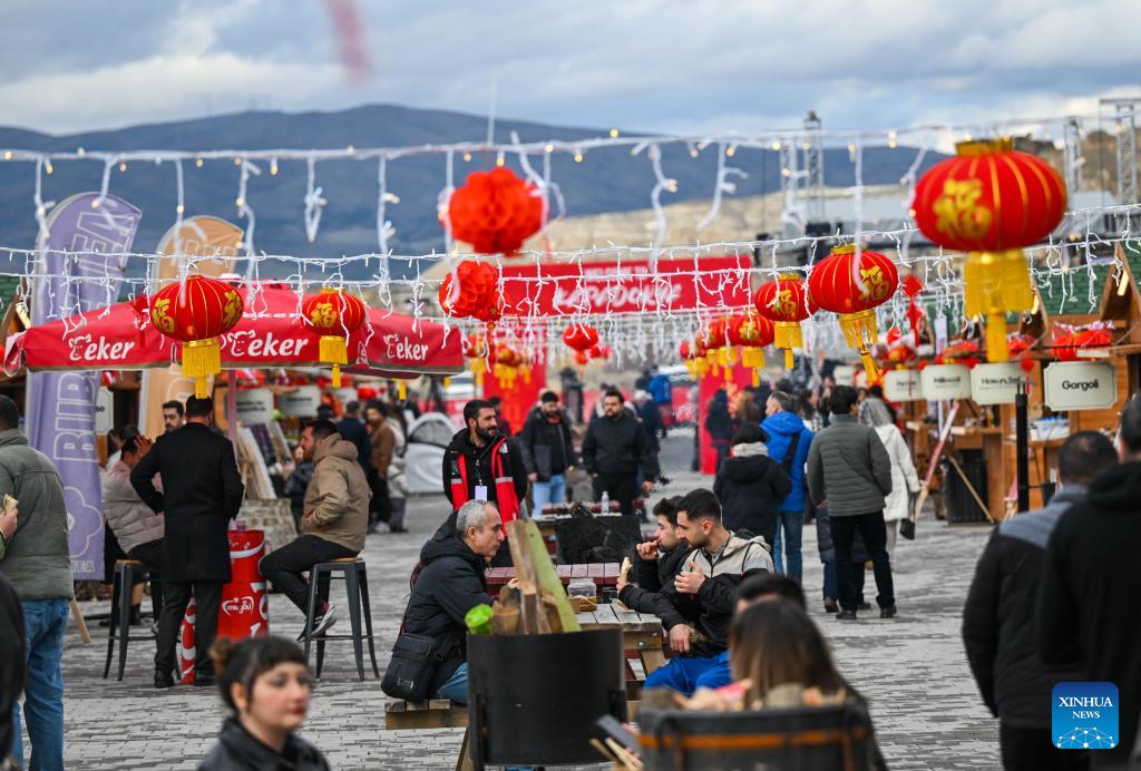 Tourists visit a food street decorated with Chinese festive elements during a Chinese Spring Festival celebration in Cappadocia, Türkiye, Feb. 14, 2026. (Xinhua/Liu Lei)