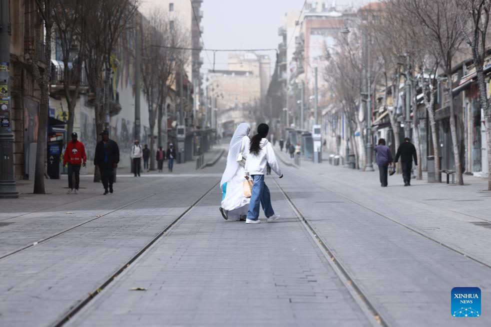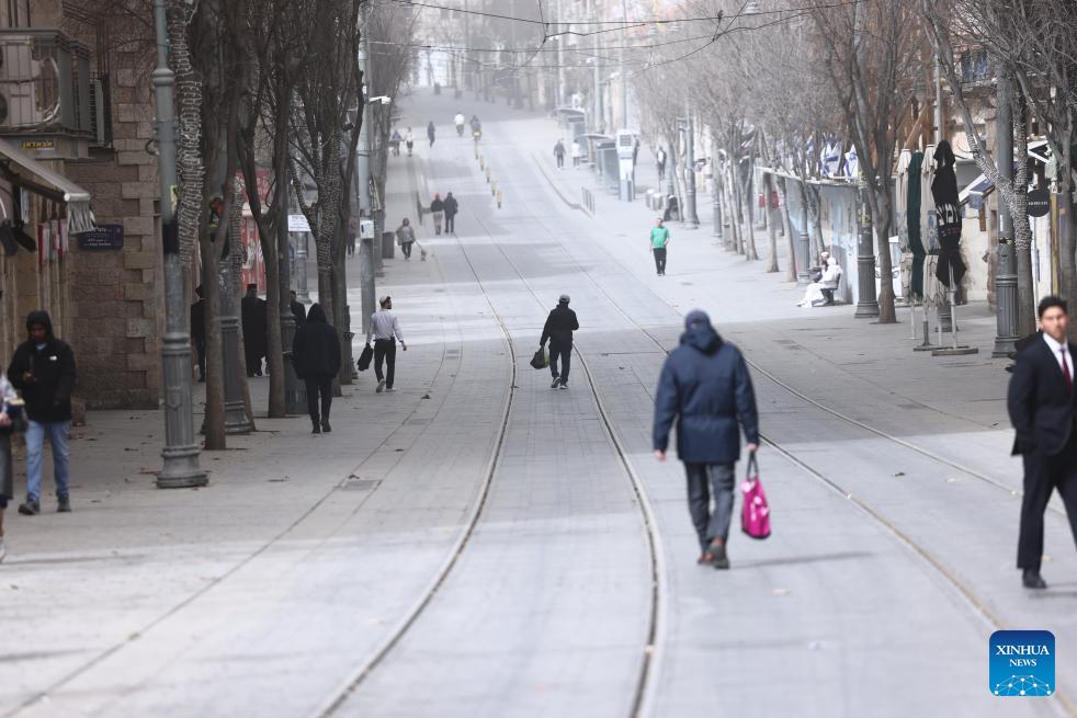 People walk during a dust storm in Jerusalem, Feb. 14, 2026. (Photo by Jamal Awad/Xinhua)