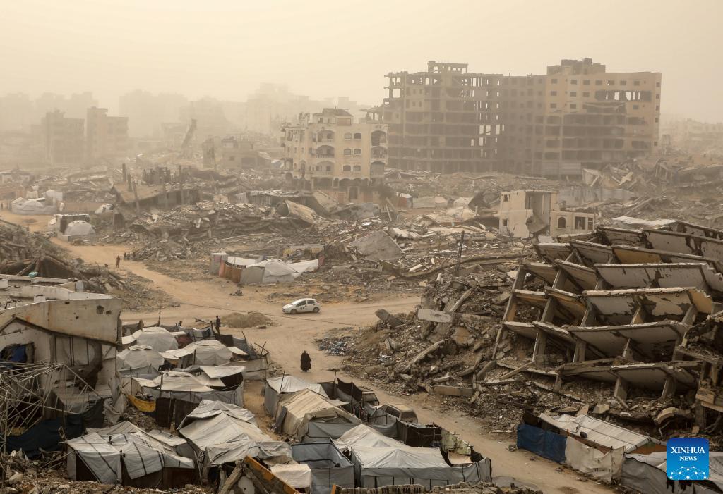 Palestinians walk among the rubble during a dust storm in southern Gaza City on Feb. 14, 2026. (Photo: Xinhua)