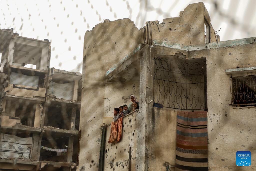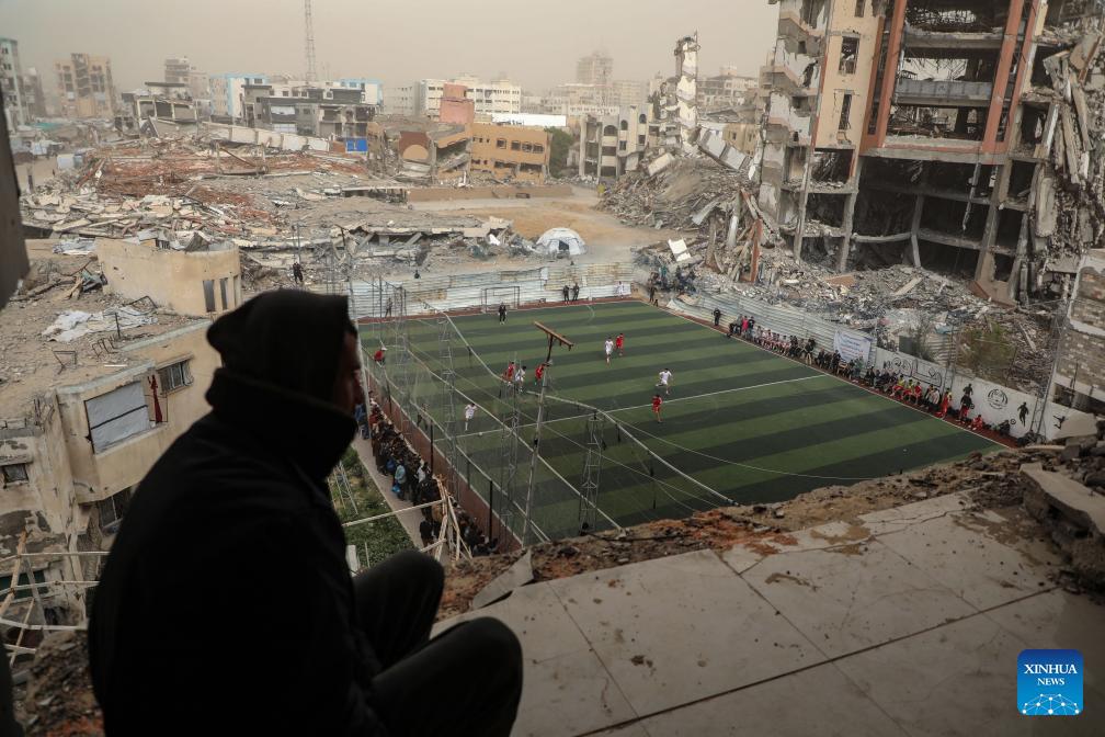 Palestinians watch a football game in south Gaza City on Feb. 14, 2026. (Photo by Rizek Abdeljawad/Xinhua)