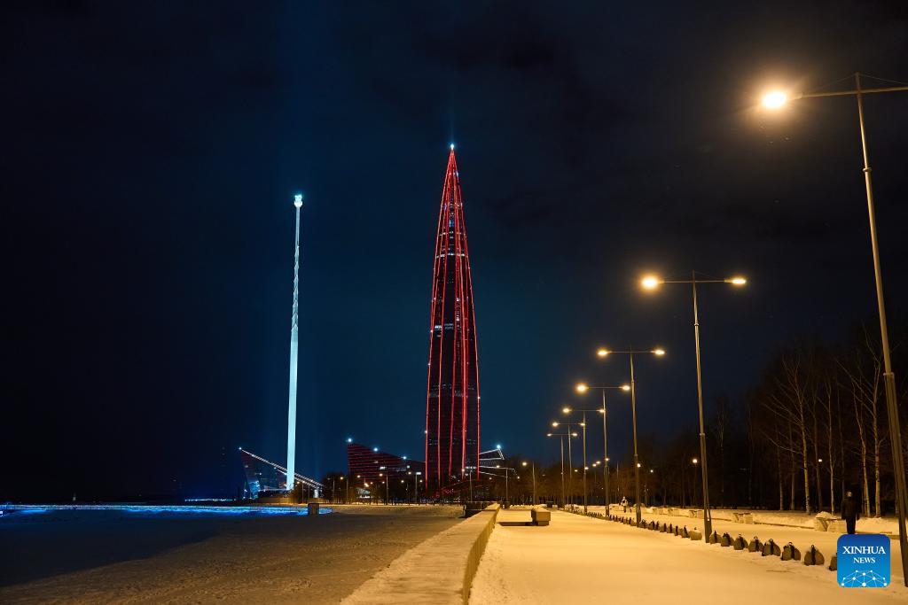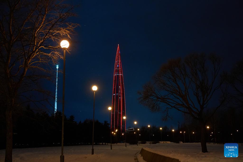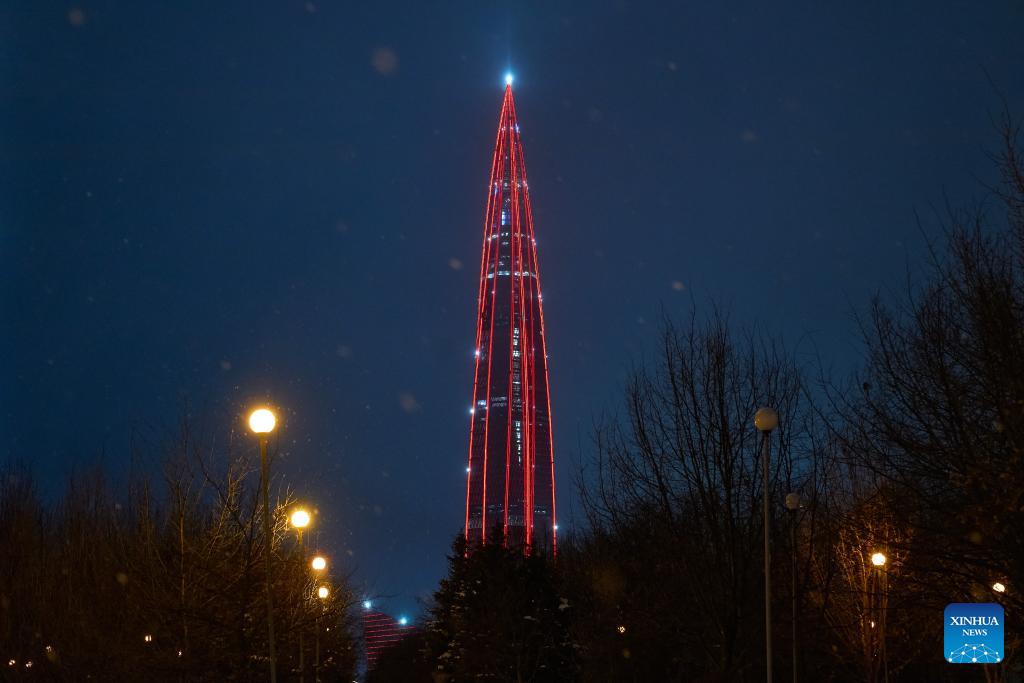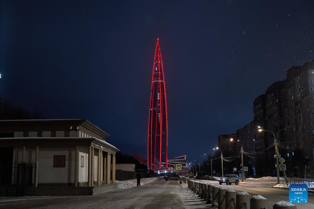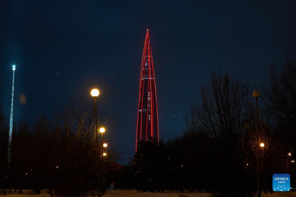 This photo taken on Feb. 15, 2026 shows Lakhta Center, the tallest building in Russia, illuminated in "China red" to celebrate the Chinese New Year in St. Petersburg, Russia. (Photo by Guo Feizhou/Xinhua)
