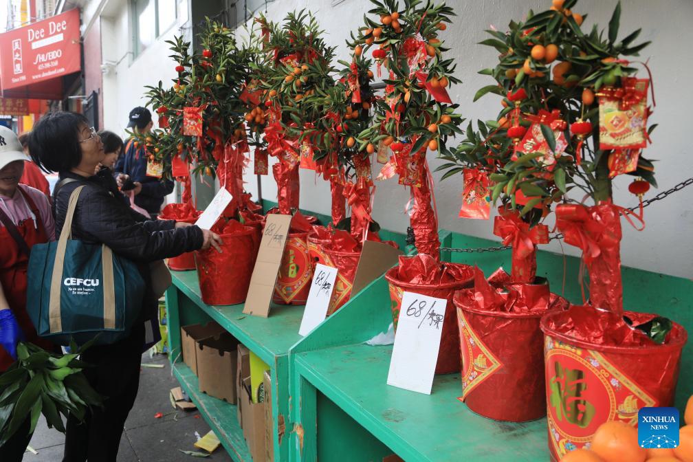 A visitor selects potted plants at the Chinatown Flower Market Fair 2026 in San Francisco, the United States, Feb. 15, 2026.