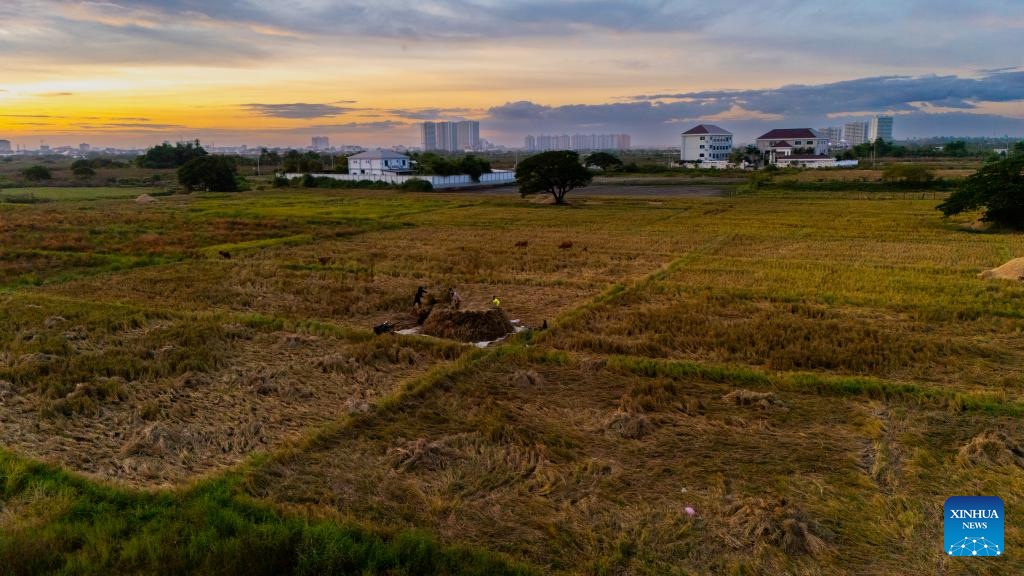 An aerial drone photo taken on Nov. 2, 2025 shows farmers harvesting rice in a rice field in Vientiane, Laos. (File photo: Xinhua)
