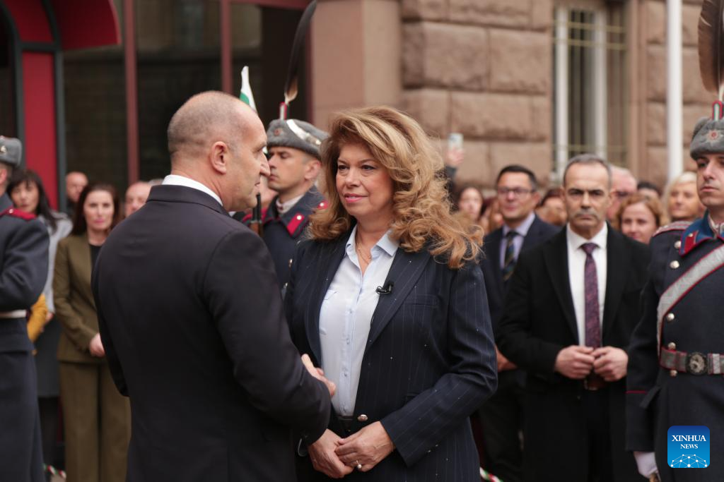 Rumen Radev (L) communicates with Iliana Iotova outside the presidential building in Sofia, Bulgaria, Jan. 23, 2026. (Photo: Xinhua)