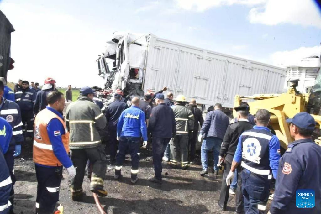This photo taken on Feb. 19, 2026 shows the accident site after two trucks collided in Port Said province, northeast of Cairo, Egypt. At least 18 people were killed and three others injured on Thursday in a collision between two trucks in Port Said province, northeast of Cairo, according to a statement from the northern Egyptian province of Dakahlia. (Photo: Xinhua)