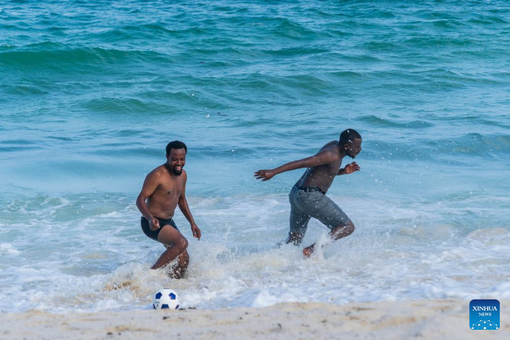 People play football on the Indian Ocean coast in Mombasa, Kenya, Feb. 18, 2026. (Photo: Xinhua)