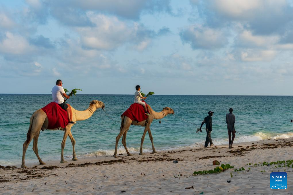 People ride camels on the Indian Ocean coast in Mombasa, Kenya, Feb. 18, 2026. (Photo: Xinhua)