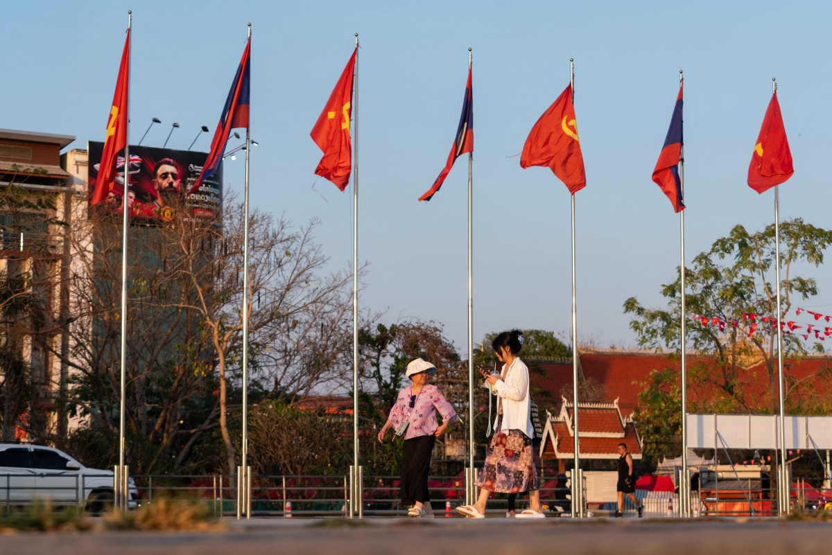 Pedestrians walk past Laos national flags and Lao People's Revolutionary Party flags displayed ahead of the election in Vientiane on February 19, 2026. (Photo: AFP)