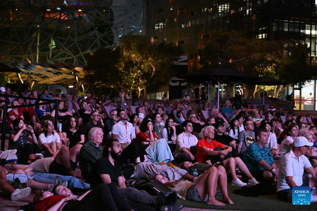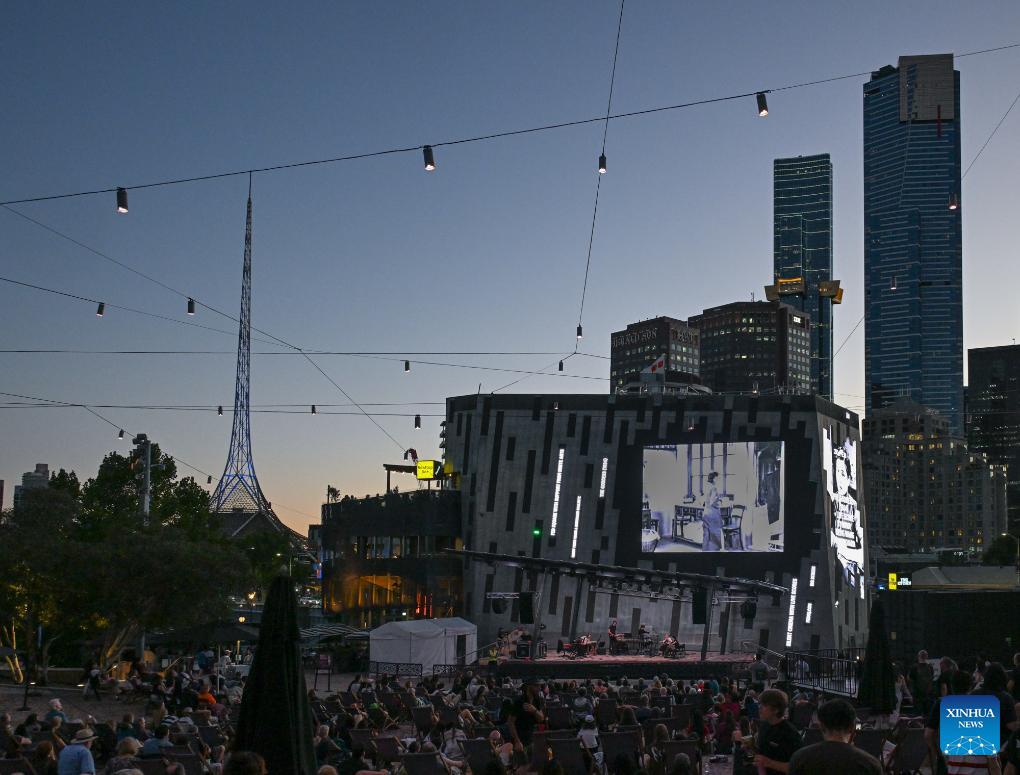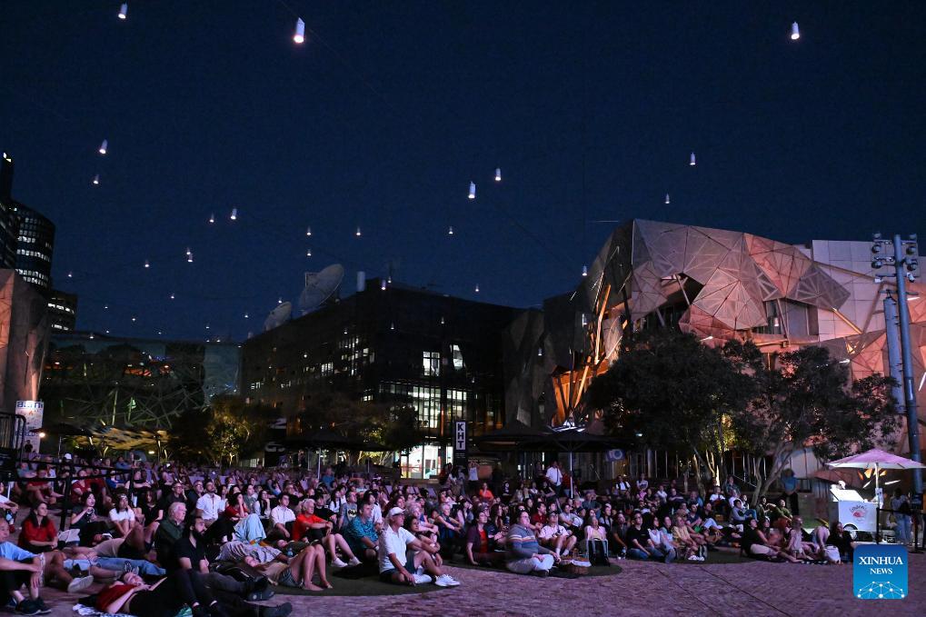 Audiences watch The Goddess, the 1934 classic Chinese silent movie, at the Federation Square in Melbourne, Australia, on Feb. 20, 2026. This is the last silent movie shown here from Feb. 16 to 20. (Xinhua/Xu Haijing)