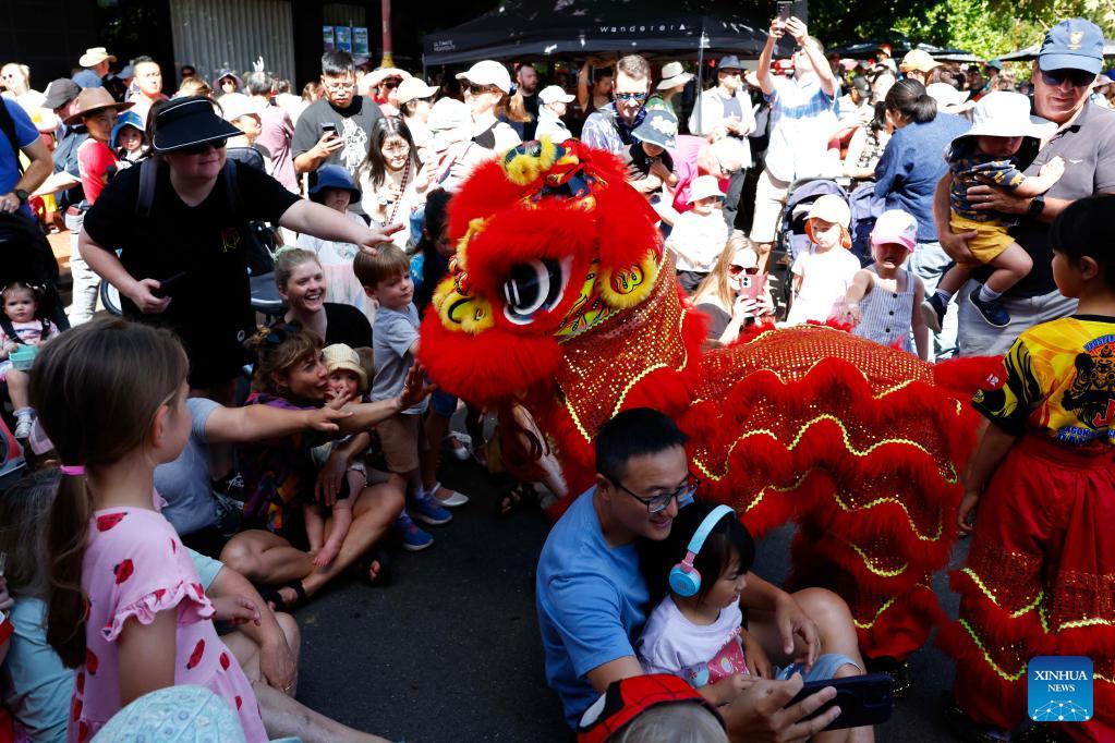 Visitors watch a lion dance performance during an event celebrating the Spring Festival in Canberra, Australia, Feb. 21, 2026. (Photo by Chu Chen/Xinhua)