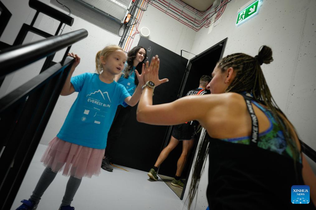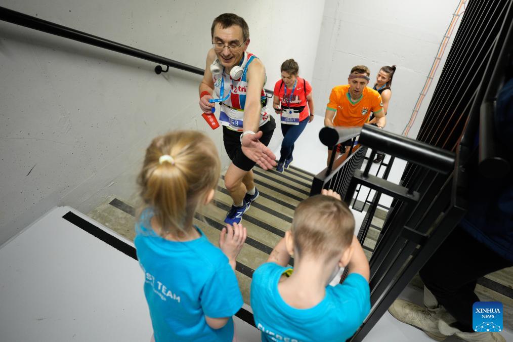 A participant (R) high-fives a child volunteer in the staircase inside the Skyliner building during the Skyliner Everest Run 2026 in Warsaw, Poland on Feb. 21, 2026. The event requires competitors to ascend the 42-floor staircase 55 times within 24 hours, reaching a cumulative height equivalent to the world's highest peak, Mount Qomolangma. (Photo by Jaap Arriens/Xinhua)