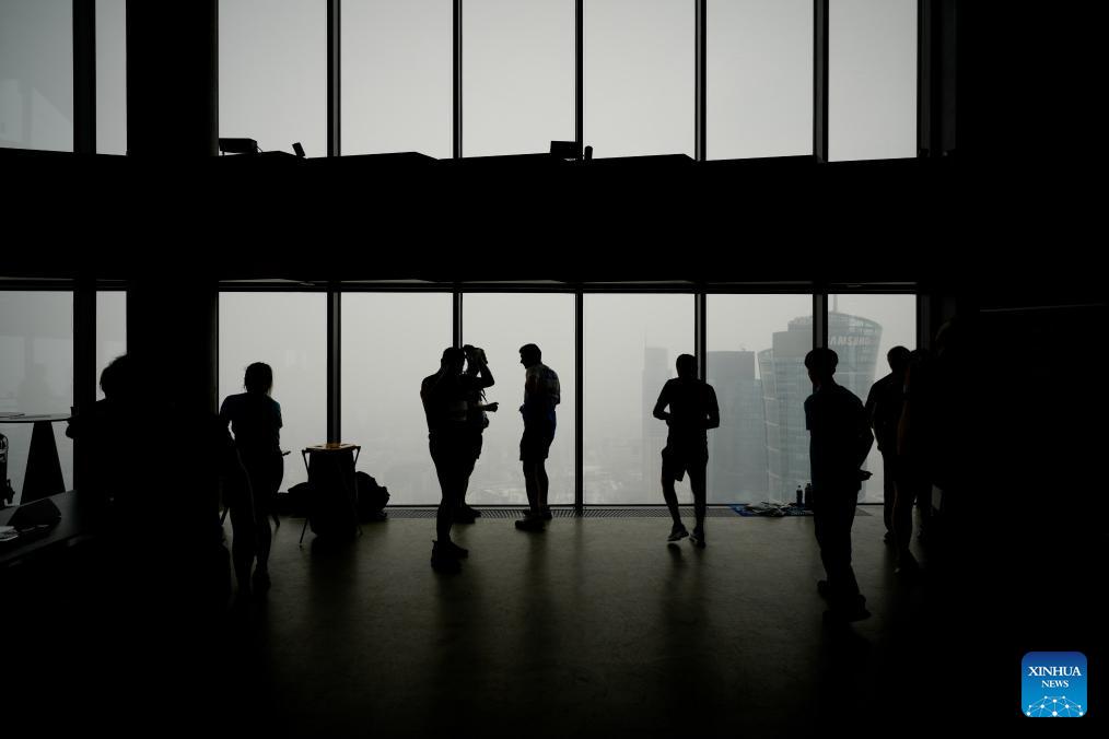 Participants rest on a high floor inside the Skyliner building during the Skyliner Everest Run 2026 in Warsaw, Poland on Feb. 21, 2026. The event requires competitors to ascend the 42-floor staircase 55 times within 24 hours, reaching a cumulative height equivalent to the world's highest peak, Mount Qomolangma. (Photo by Jaap Arriens/Xinhua)