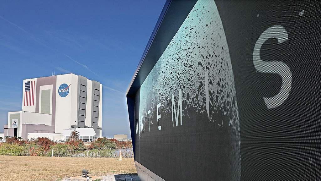 The countdown clock for the launch of NASA's Artemis II SLS rocket near the massive Vehicle Assembly building at the Kennedy Space Center in Cape Canaveral, Florida, February 20, 2026. (Photo: VCG)