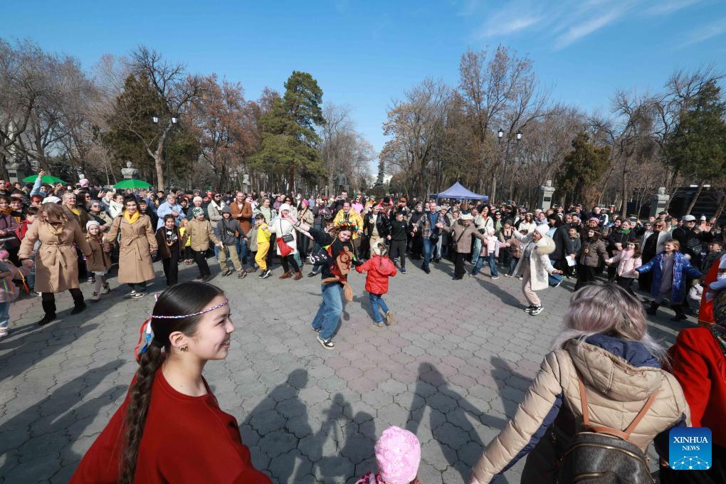 People dance during Maslenitsa celebrations in Bishkek, Kyrgyzstan, on Feb. 22, 2026. Maslenitsa is a traditional holiday to celebrate the beginning of spring. (Photo by Roman/Xinhua)