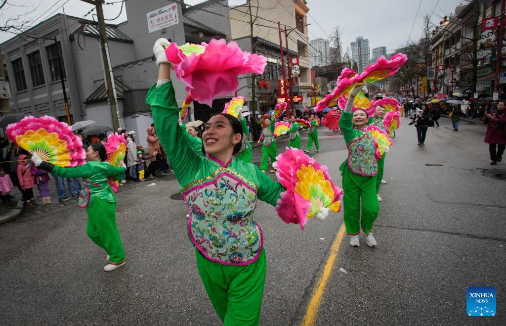 Dancers perform along the street during a Spring Festival parade at Chinatown in Vancouver, British Columbia, Canada, on Feb. 22, 2026. The 52nd annual Vancouver Chinatown Spring Festival Parade was held here on Sunday to celebrate the Chinese Year of the Horse. (Photo by Liang Sen/ Xinhua)