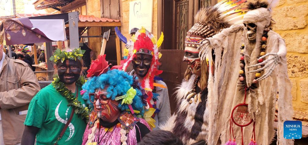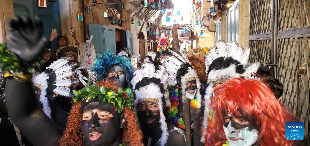 Participants are pictured during the traditional "Zambo" parade in Tripoli, northern Lebanon, on Feb. 22, 2026. People painted their bodies black, wore feathers, torn clothing, and masks, and marched through the streets in groups carrying swords and daggers, beating drums, and singing old songs on the last Sunday before the fasting season begins. (Photo by Ali Hashisho/Xinhua)