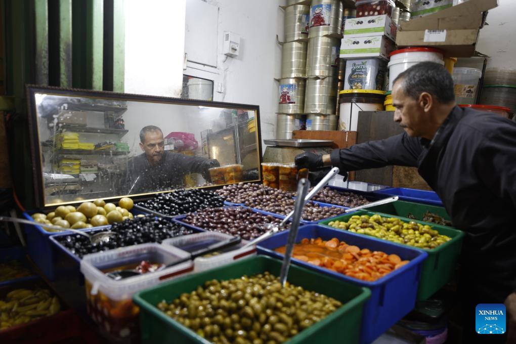 People shop for a variety of pickles during the holy month of Ramadan in the Old City of Jerusalem, Feb. 22, 2026. (Photo by Jamal Awad/Xinhua)