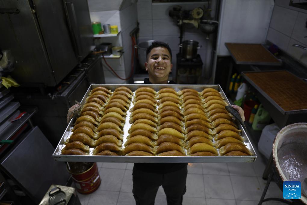 A man displays traditional sweets known as "Qatayef" during the holy month of Ramadan in the Old City of Jerusalem, Feb. 22, 2026. (Photo by Jamal Awad/Xinhua)