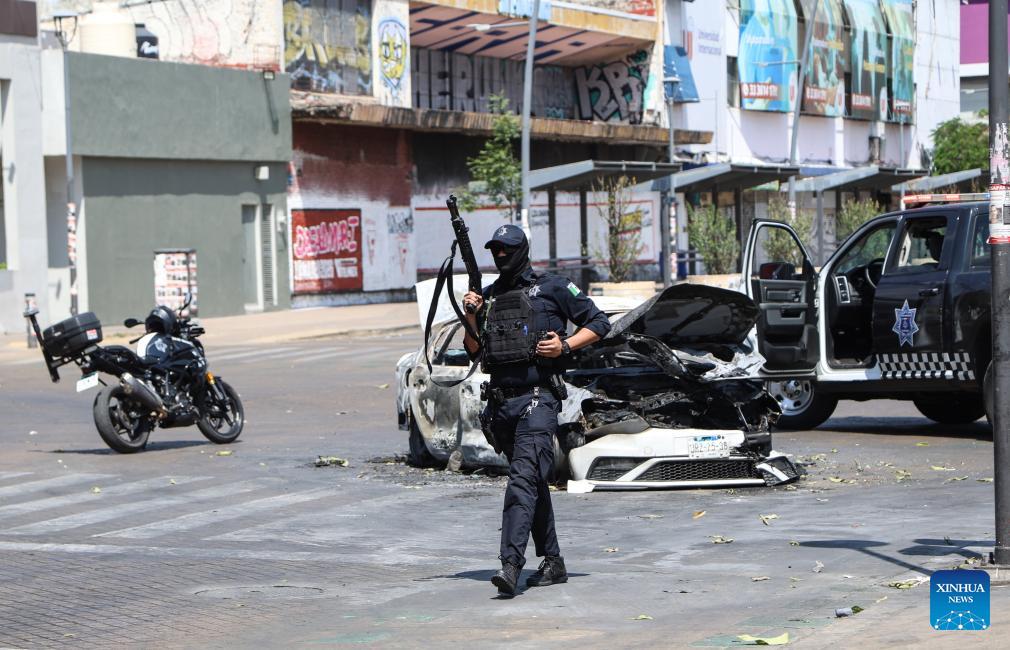 A policeman guards near a burnt car on a street in Guadalajara, capital of Jalisco state, Mexico, on Feb. 22, 2026. (Photo: Xinhua)