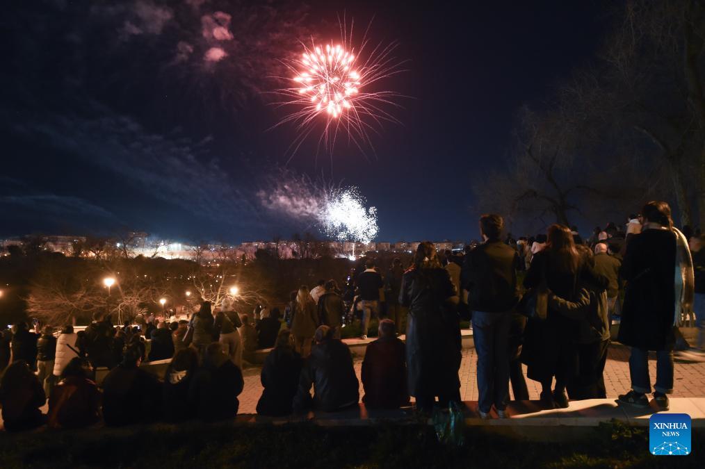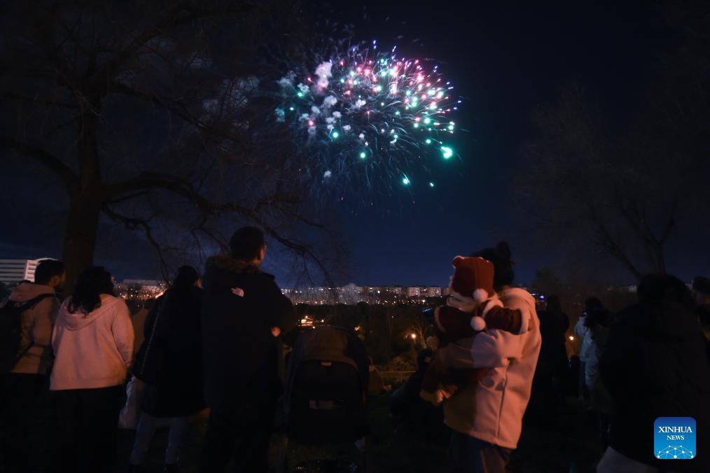 This photo taken on Feb. 21, 2026 shows fireworks celebrating the Chinese New Year in Madrid, Spain. Fireworks lit up the sky over Pradolongo Park on Saturday as the city marked the Chinese New Year. (Photo by Gustavo Valiente/Xinhua)
