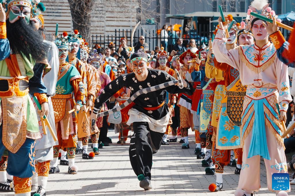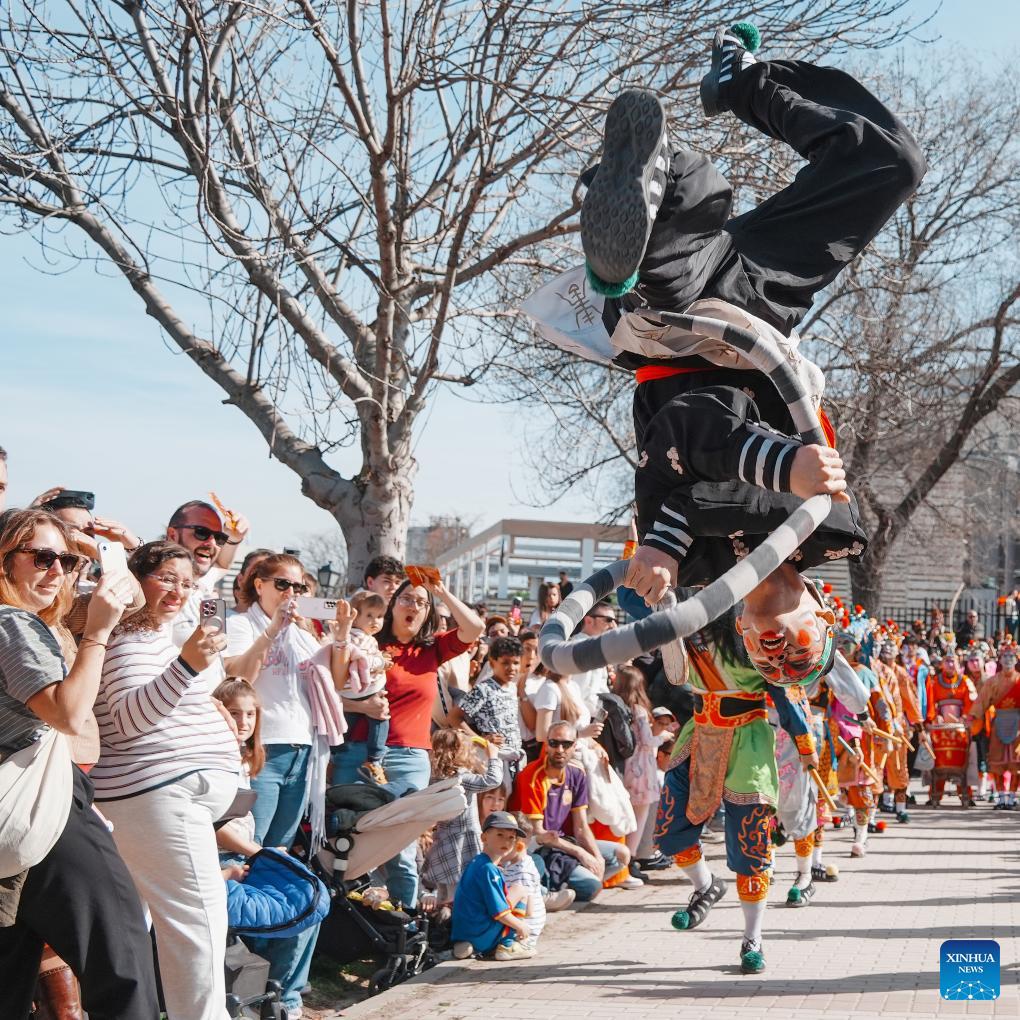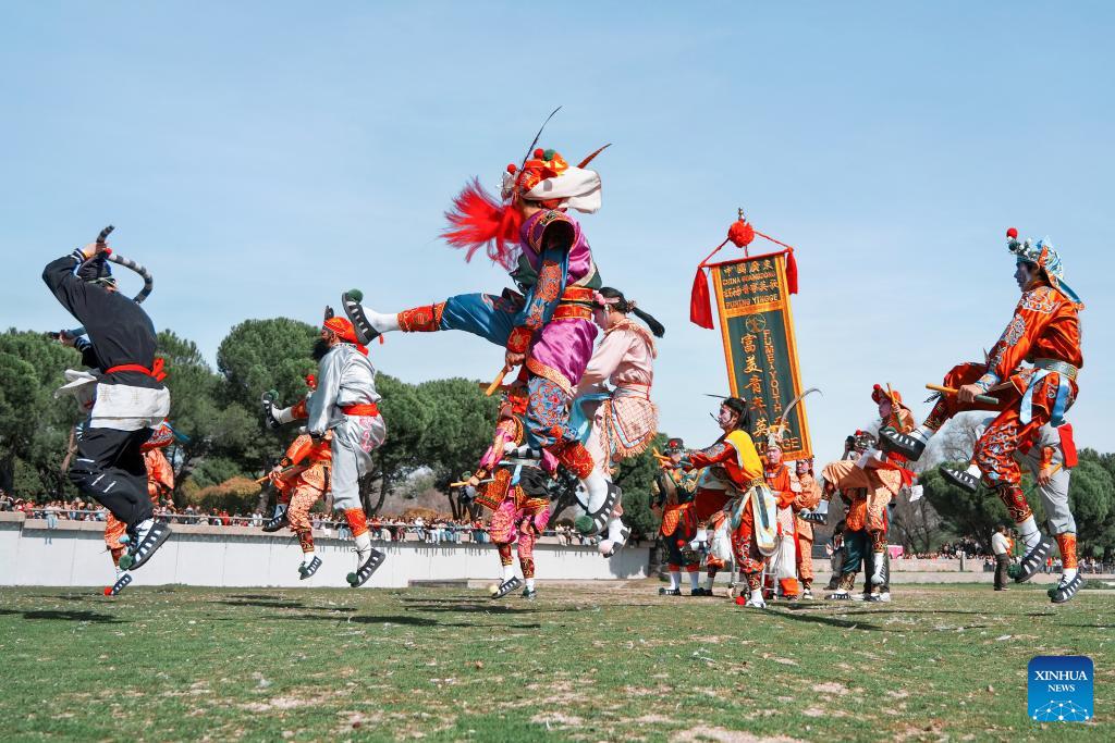 Yingge performers take part in a parade celebrating Chinese New Year in Madrid, Spain, Feb. 22, 2026. (Photo by Zhang Yuheng/Xinhua)