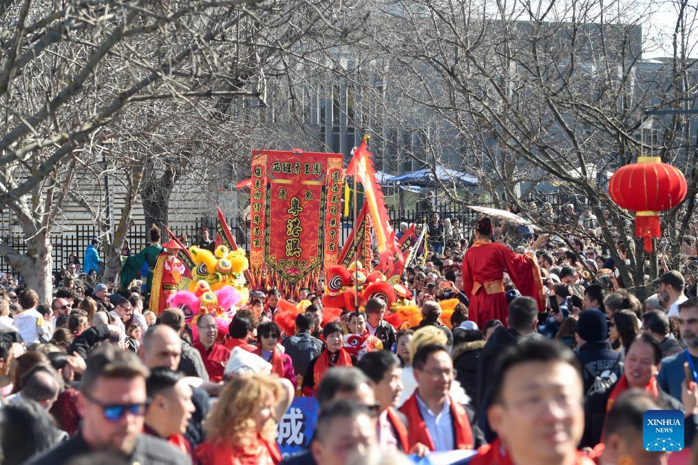 People watch lion dance during a parade celebrating Chinese New Year in Madrid, Spain, Feb. 22, 2026. (Photo by Gustavo Valiente/Xinhua)