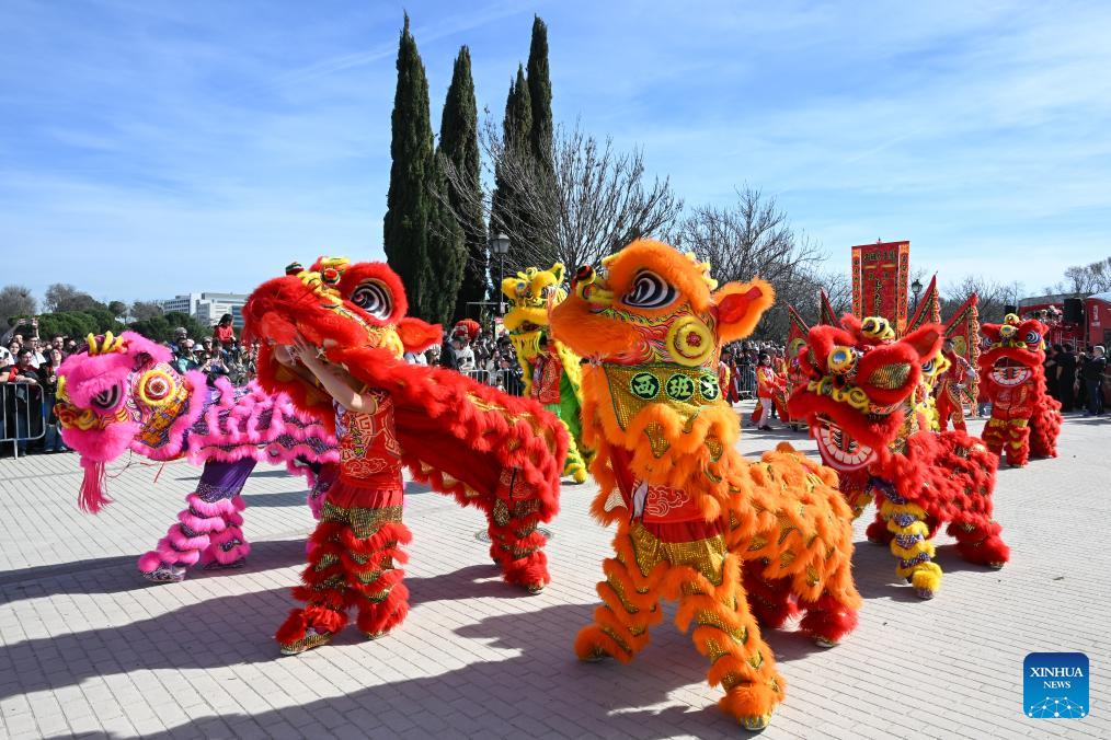 Lion dancers perform during a parade celebrating Chinese New Year in Madrid, Spain, Feb. 22, 2026. (Photo by Gustavo Valiente/Xinhua)