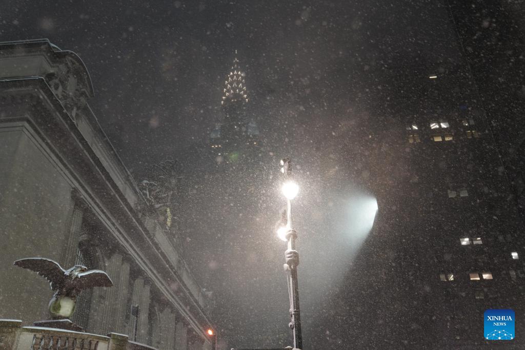 The Grand Central Station and other iconic buildings are seen in snow in New York, the United States, on Feb. 22, 2026. New York City (NYC) Mayor Zohran Mamdani on Sunday declared a state of emergency and issued a travel ban as a winter storm hit the region, causing hundreds of flight cancellations. (Photo: Xinhua)