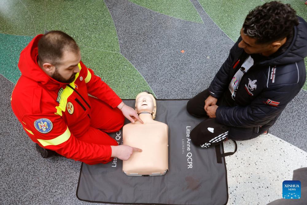 A paramedic (L) explains resuscitation maneuvers on a medical mannequin during the 5th edition of Resuscitation Marathon at a mall in Bucharest, Romania, Feb. 21, 2026. (Photo by Cristian Cristel/Xinhua)