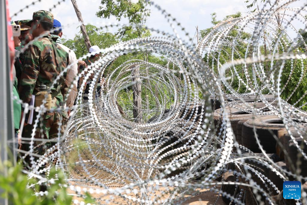 This photo taken on Aug. 14, 2025 shows barbed wire and tyres deployed by Thai armed forces, in Banteay Meanchey province, Cambodia. (File photo: Xinhua)